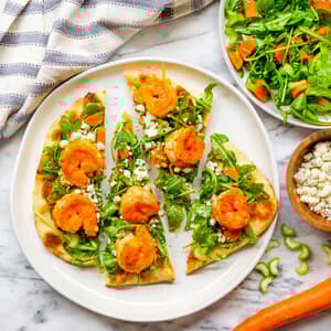 Buffalo Shrimp Flatbread with Blue Cheese & Pickled Veggie Salad