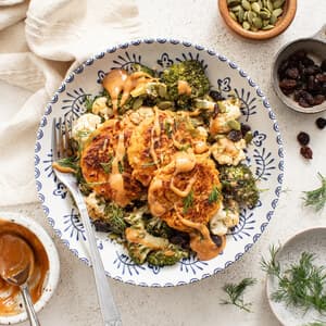 Sweet Potato Fritters with Smoky Tahini Sauce, Broccoli & Cauliflower