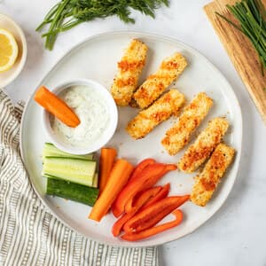 Crispy Baked Tofu with Hot Sauce, Veggie Sticks & Herby Ranch Dressing